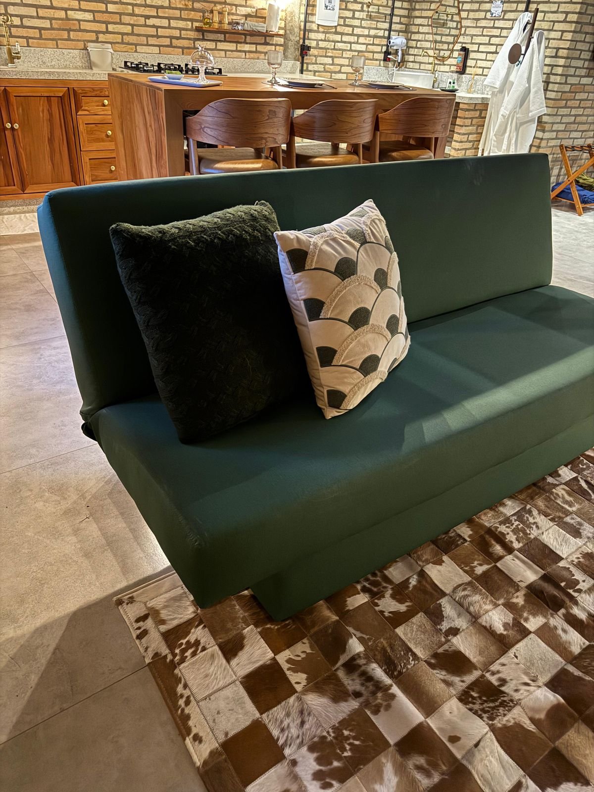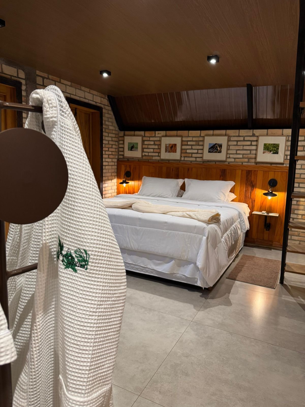O chalé dispõe de uma confortável cama king-size para noites de sono profundo e restaurador, além de uma cama extra ideal para quem deseja se hospedar com um filho. A cozinha é equipada com utensílios, geladeira, fogão e cafeteira, oferecendo praticidade para preparar pequenas refeições durante a estadia.
