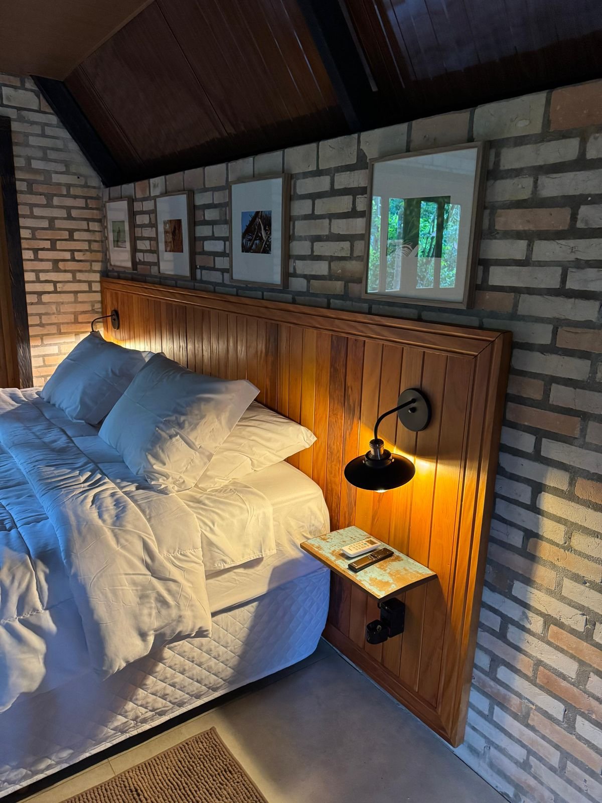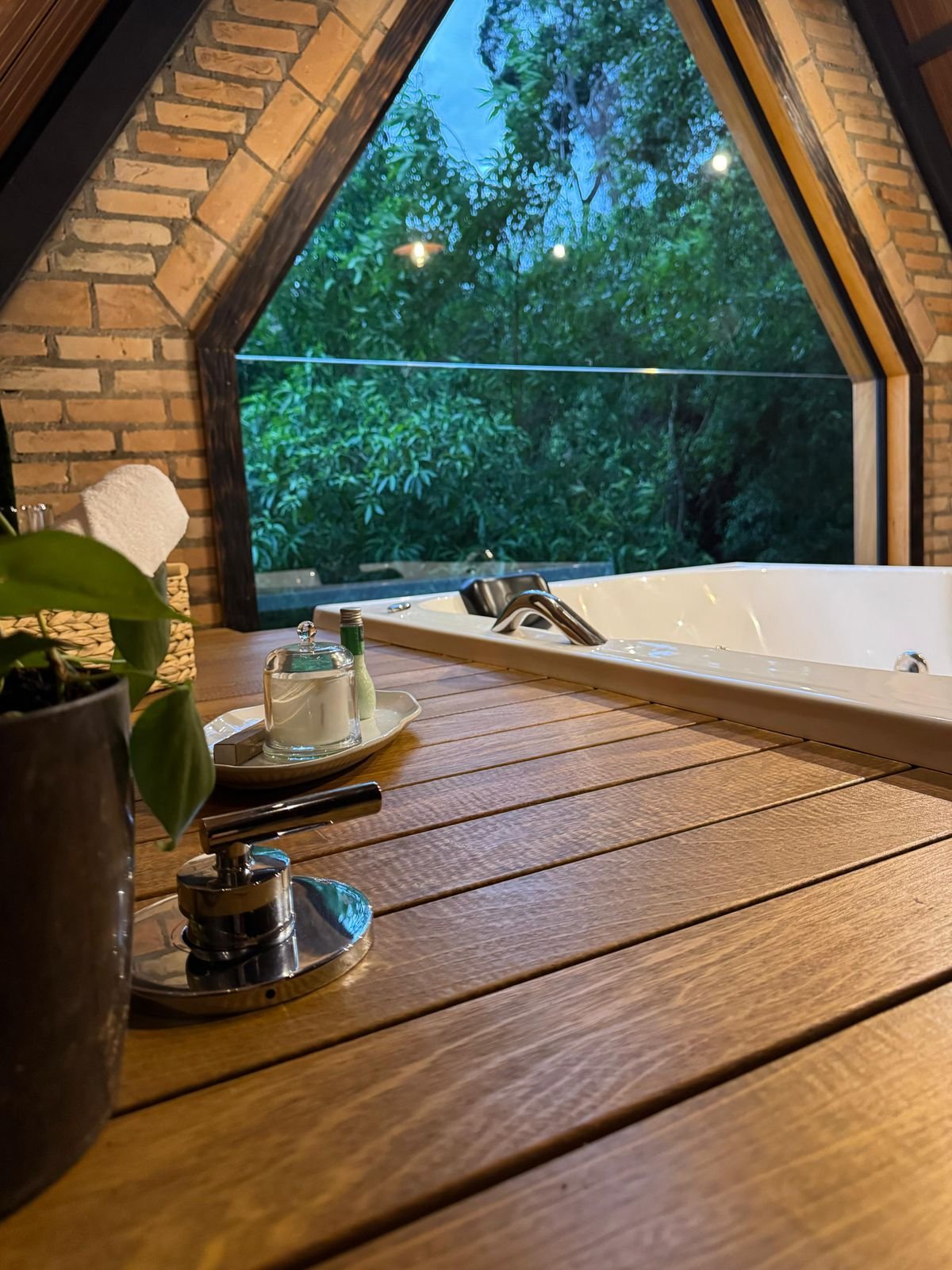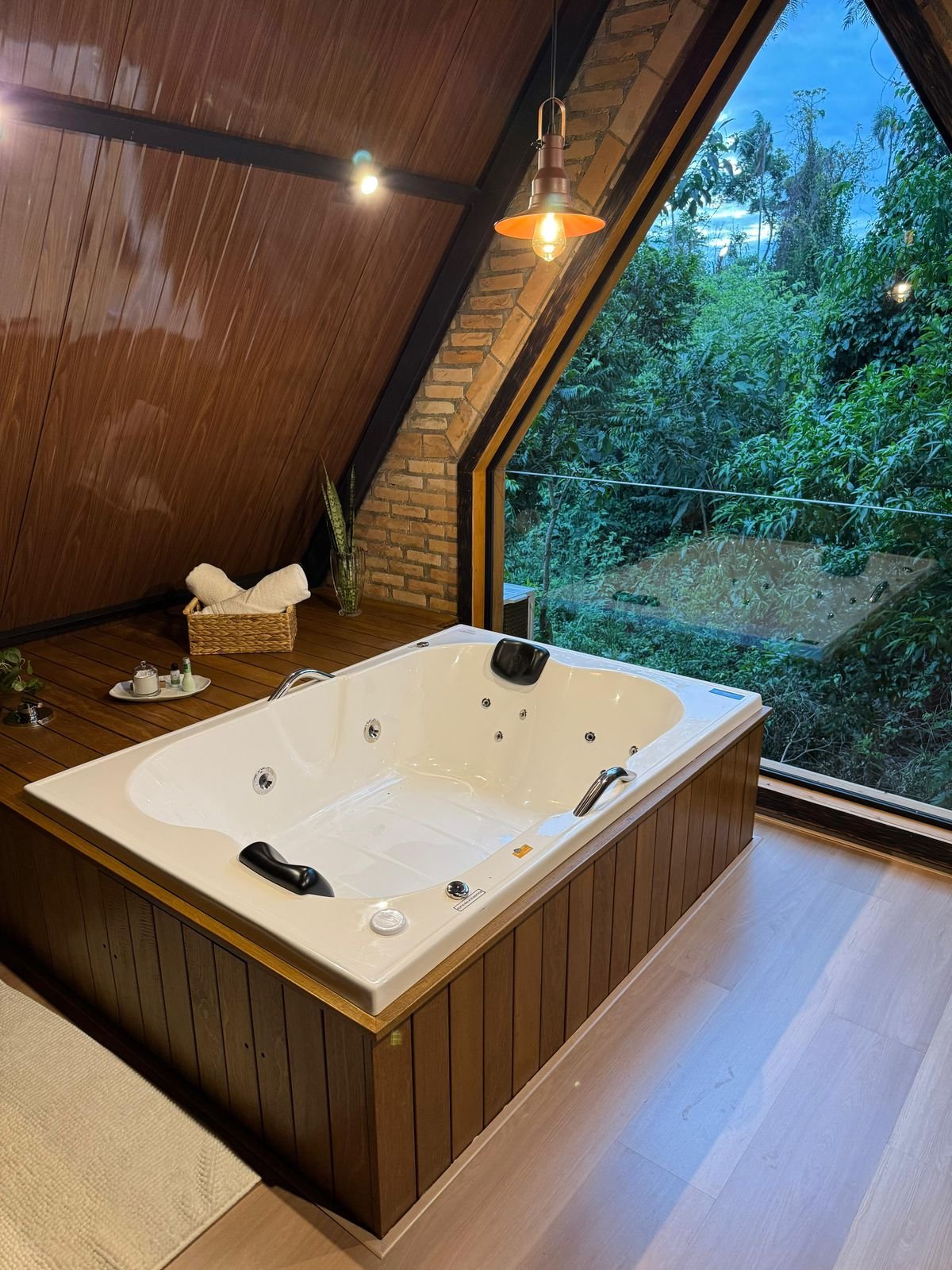 Para completar a experiência, o espaço conta com um banheiro privativo amplo com acabamento rústico e elegante, uma banheira de hidromassagem para duas pessoas perfeita para banhos relaxantes à luz de velas, e uma lareira que aquece as noites criando uma atmosfera ainda mais aconchegante. A rede suspensa convida para momentos de leitura, descanso ou contemplação, tornando cada instante ainda mais especial em meio à natureza.