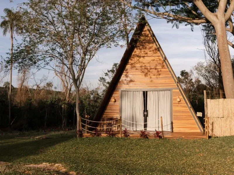 Deck externo com churrasqueira portátil, jogo externo, redario e lareira e sauna para 2 pessoas.